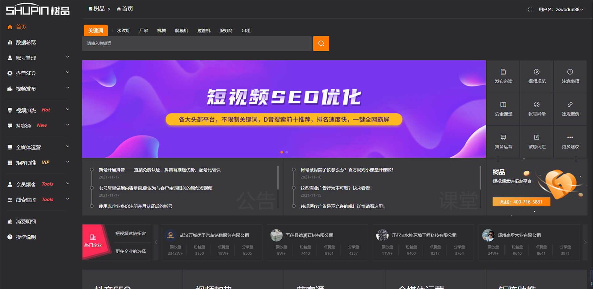 幫助企業(yè)解決在短視頻營(yíng)銷中的內(nèi)容生產(chǎn)、賬號(hào)搭建、賬號(hào)運(yùn)營(yíng) 、精準(zhǔn)低成本引流、業(yè)務(wù)場(chǎng)景、服務(wù)場(chǎng)景、服務(wù)效率等問題的短視頻營(yíng)銷拓客平臺(tái)。